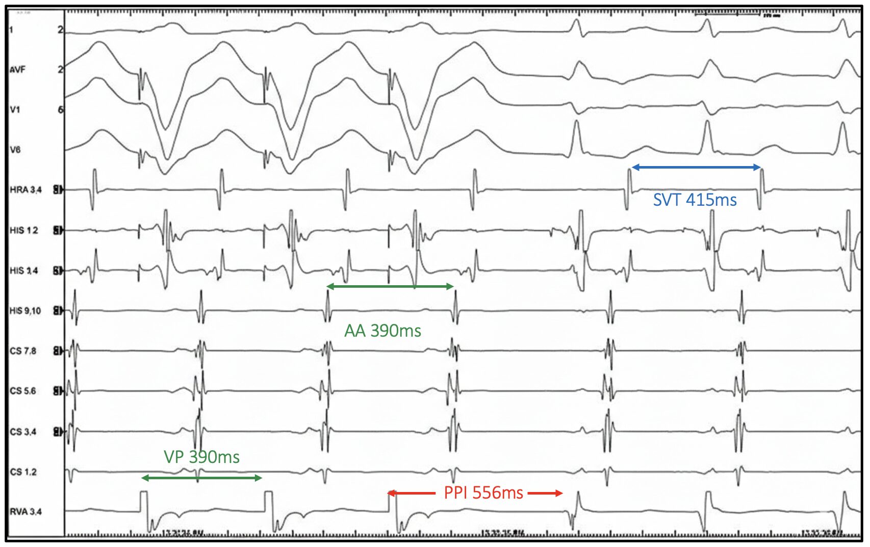 A PPI – TCL of 141ms would suggest AVNRT in this case. But interpretation should not stop here. See the EGM below with additional callipers.